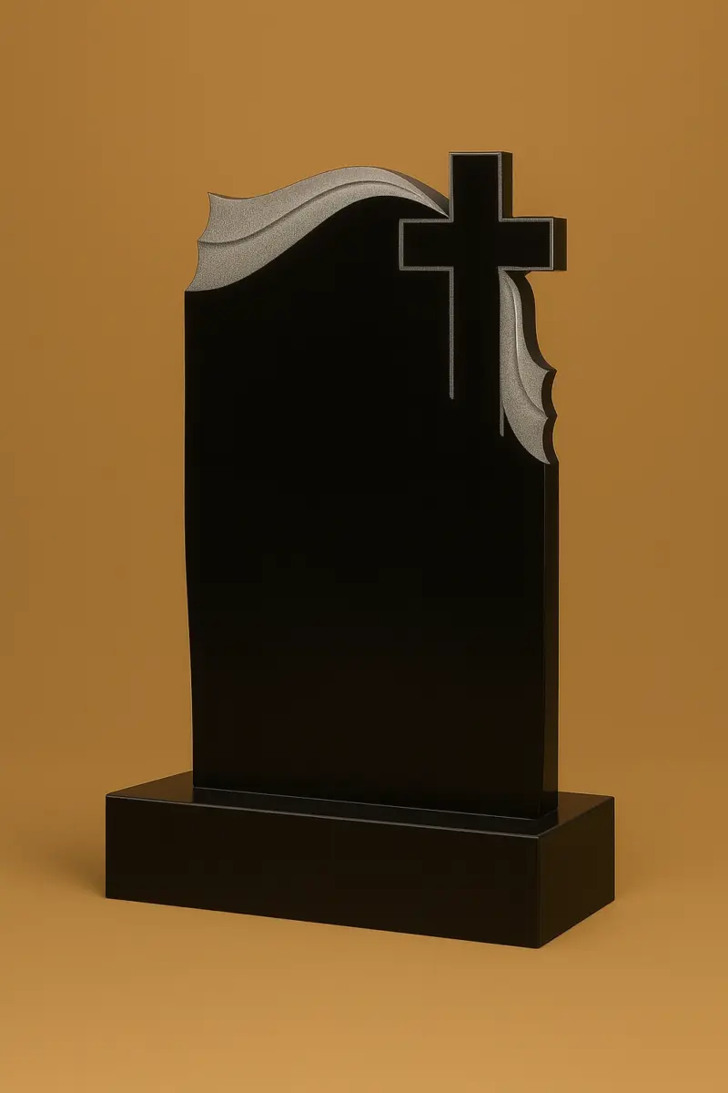 Полірована чорна поверхня контрастує з сірим рельєфом, підкреслюючи художній характер композиції. Модель підходить для індивідуальних поховань людей, які жили з вірою, любов’ю та добротою в серці.