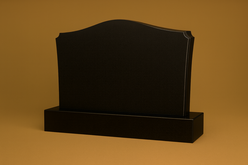 Цей пам’ятник із чорного граніту вирізняється шляхетною формою та м’якою хвилею у верхній частині, яка поєднує строгість і витонченість. Складний контур по краях додає глибини та індивідуальності, ніби відображаючи багатогранність життя і характеру людини, чию пам’ять він береже.