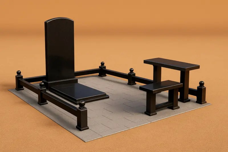 Горизонтальна плита, стримана огорожа з акуратними стовпчиками та зручний гранітний столик із лавкою формують продуманий, збалансований простір для спокійного вшанування та перебування. Світла плитка основи створює візуальний контраст із темним каменем і додає композиції охайності та завершеності.