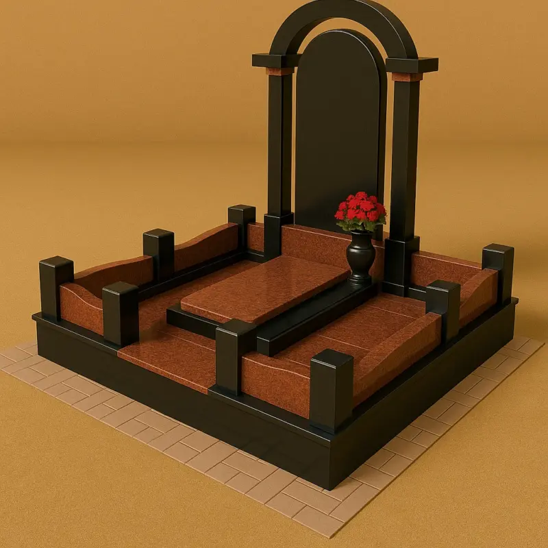 Підвищена плита, симетричне огородження та декоративна ваза з квітами створюють завершений, урочистий образ. Комплекс виглядає монументально, але водночас стримано й благородно, підходить для тих, хто цінує класичний стиль, чітку геометрію та довговічні матеріали.