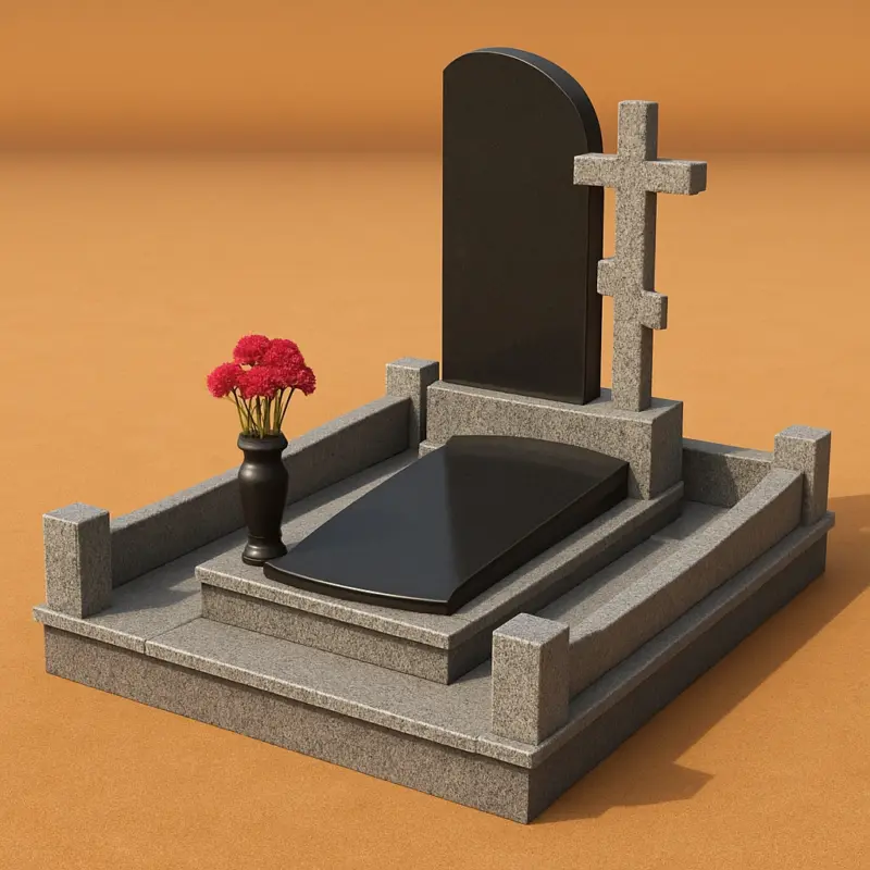Плавна надмогильна плита з чорного граніту гармонійно вписується в загальну композицію, а масивна основа зі світлого каменю додає відчуття надійності та спокою. Лаконічна огорожа формує впорядкований простір, зберігаючи відчуття відкритості та світла. Ваза з квітами виступає теплим емоційним акцентом, символом пам’яті та живого зв’язку.
