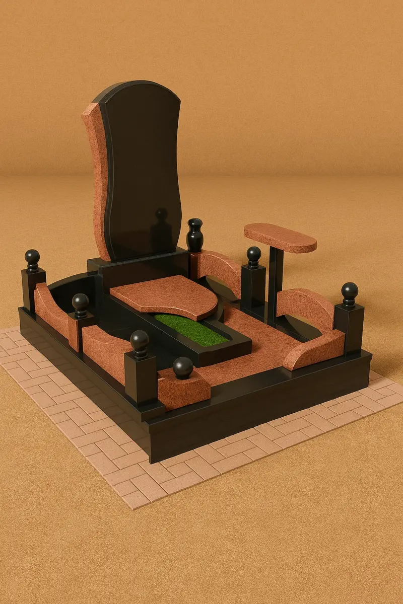 Меморіальний комплекс виконаний у стриманій, благородній стилістиці з поєднанням чорного та червоного граніту. Плавні лінії вертикальної стели надають композиції відчуття спокою та внутрішньої сили, а контраст фактур підкреслює глибину задуму. Огородження з декоративними балясинами формує завершений простір пам’яті, відокремлюючи його від зовнішнього світу. Акуратна квіткова ніша та лавка створюють місце для тихого вшанування й роздумів. Комплекс символізує повагу, світлу пам’ять і гідність, зберігаючи теплий, людяний характер навіть у строгих формах.