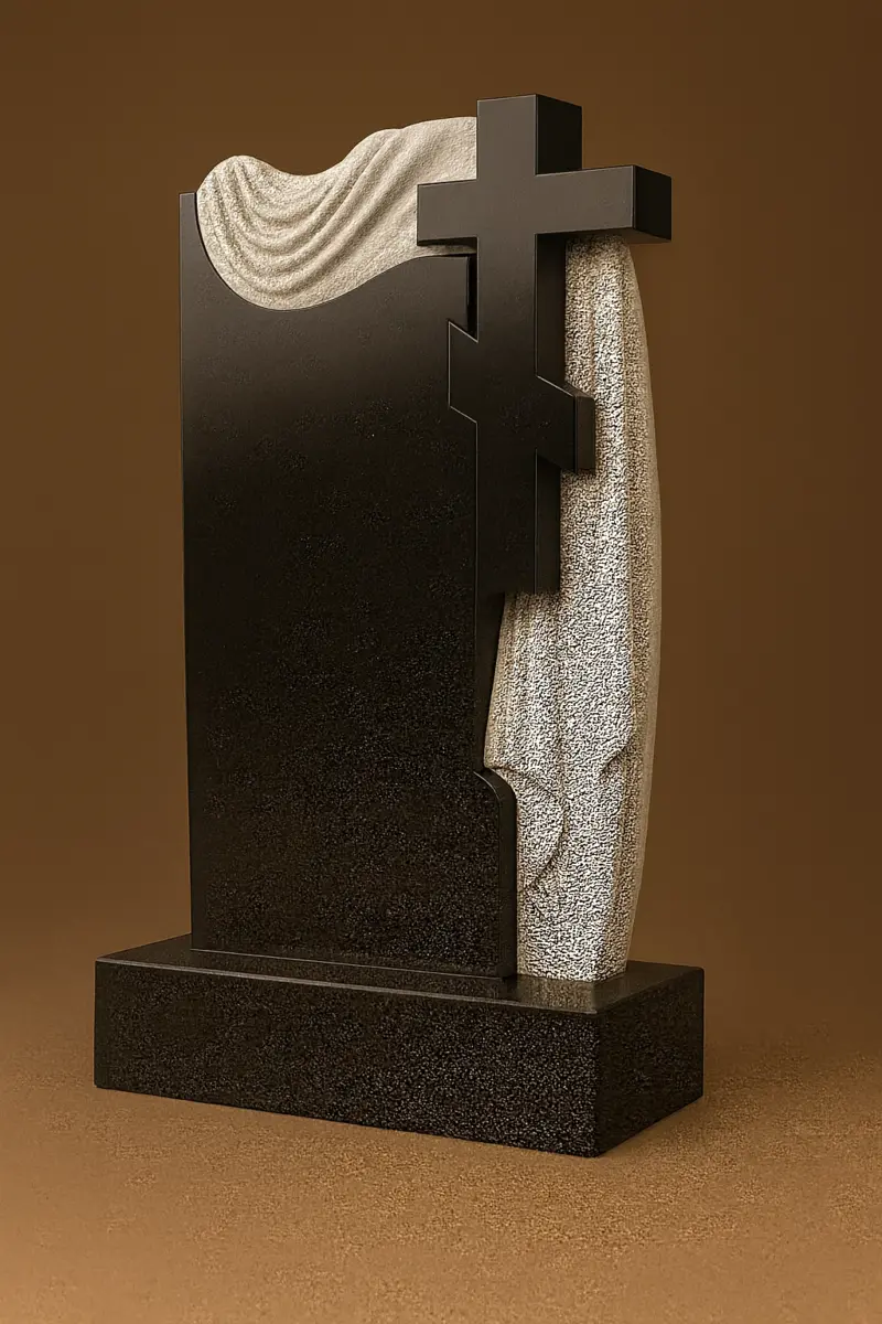 Цей величний пам’ятник є поєднанням духовної сили та вишуканої майстерності. Композиція складається з глибокого чорного та світло-сірого граніту, що символізують протиставлення земного та небесного. В центрі – потужний православний хрест, що виступає з композиції як стовп віри й надії.